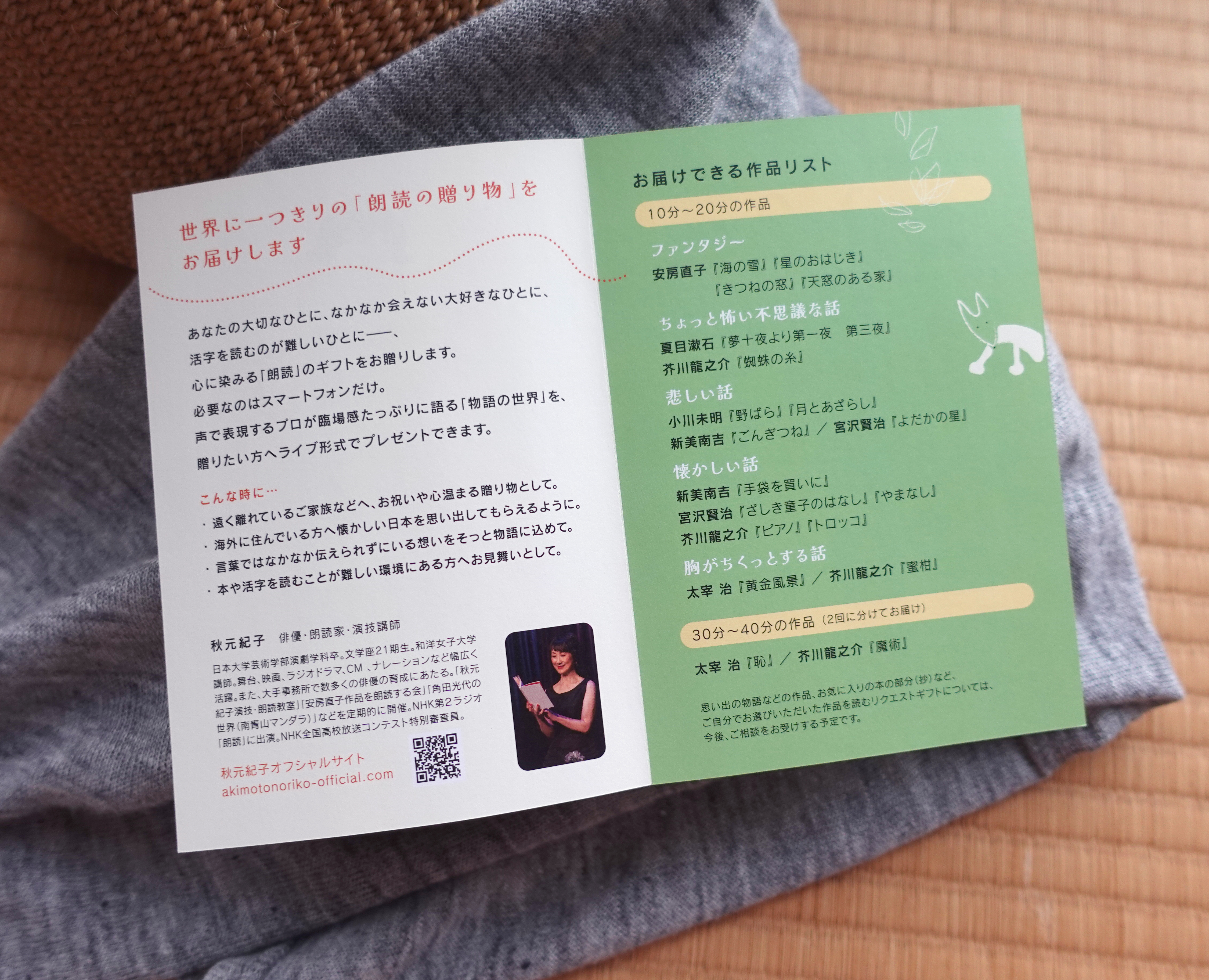 朗読をギフトにしたいという秋元紀子さんのアイデアと想いをカタチにしたミニリーフレットのイラストを描かせてもらいました。最近SNSがショップカードや名刺代りになっていますが、ミニリーフレットは自分のやりたい事を確認するためのお守りのような役割もあると思います。